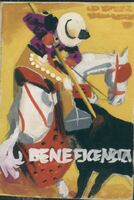 Beneficencia 2 Sobre un fondo amarillo y bajo el título de “beneficencia” se ha representado de perfil un rejoneador sobre su caballo blanco clavando su lanza a un toro negro. En la parte superior destacan bocetos de palabras doradas.