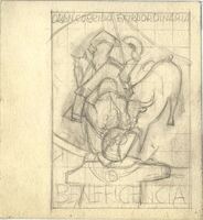 Beneficencia Sobre una superficie cuadriculada y en un dibujo enmarcado y a modo de boceto se representa la lid entre un torero y un toro bajo el lema de “beneficencia”. Predominan las líneas en tonos oscuros sobre un fondo claro.