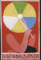 Beneficencia En el dibujo enmarcado donde destaca el título en la parte inferior de color blanco y con letras caligráficas se ha representado, sobre un fondo rojo, la figura de una mujer de la que solamente se ven sus brazos sujetando una sombrilla amarilla, blanca, azul y verde, tapando su rostro.