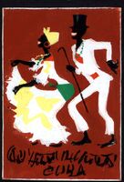 Baile Mulato Sobre un fondo rojo vino, la figura de una pareja de color bailando con trajes cubanos. La gracia que consigue el artista, con tan poco elementos compositivos, es más que destacable.