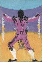 Bailarina negra con vestido blanco, amarillo y transparente Sobre un fondo castaño rojizo destaca la figura de una mujer negra con los pies descalzos que agita su cuerpo en movimientos de baile. Le cubre el cuerpo un vestido blanco y amarillo, vaporoso y transparente. En su cabeza un pañuelo también amarillo le sujeta el pelo. De su cuello cuelga un collar.
