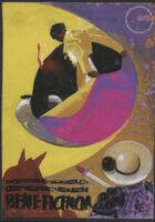 Beneficencia En el título de este dibujo en el que solamente se lee “beneficencia” en letras de color negro se aprecia una escena taurina. En primer plano se ve la cabeza de un rejoneador con sombrero y en segundo plano, de espalda, se vislumbra a un torero con el traje amarillo que con su capa rosa y amarilla torea a un toro negro.