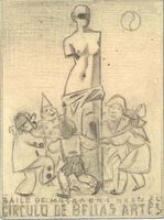 Baile de máscaras. Círculo de Bellas Artes En el centro de un corro creado por seres diminutos se encuentra una estatua femenina al estilo clásico sin extremidades superiores. Predominan las líneas grises sobre un fondo claro.