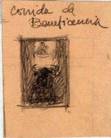 Corrida de beneficencia Bajo el lema de “corrida de beneficencia”, situado en la parte superior, se ha representado en una escena taurina, enmarcada en el centro de la composición, la figura de un toro negro, de espalada y del que se ve su cabeza solamente. El animal parece observar fijamente la imagen de un torero al fondo, en segundo plano. Predominan las líneas de color negro.