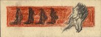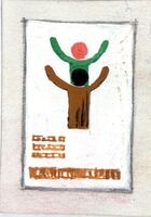 Dos hombres con cuerpo de tronco levantan sus brazos En este dibujo enmarcado se destacan sobre un fondo blanco dos hombres con el cuerpo en forma de tronco marrón y verde, con la cabeza negra y roja, respectivamente. Levantando los brazos hacia arriba. En el dibujo se aprecian algunas inscripciones marrones en la parte inferior de la derecha, de difícil lectura.