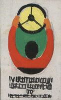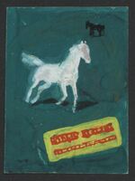 El caballo blanco y el caballo negro En el dibujo enmarcado, en el que destaca una palabra de color rojo dentro de un rectángulo amarillo pero de difícil lectura por tratarse de un boceto, se han representado a dos caballos sobre un fondo verde: en primer término, un caballo blanco; en segundo término, un caballo negro.