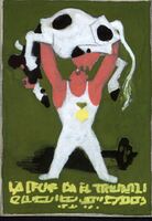 El culturista y la vaca La figura de un culturista (pesas, medalla en el pecho) levantando una vaca, y bebiendo directamente leche de ella, ocupando el centro de la escena sobre un fondo verde. El mensaje fortalecedor de la leche está claro.