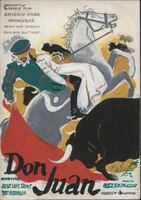 Don Juan En este cartel en el que se lee “Don Juan” con letras de color negro se ha representado, sobre un fondo claro, al héroe de la obra teatral montado en un caballo grisáceo, que levanta sus patas delanteras, toreando con una capa roja a un toro negro. El traje del protagonista es verde. En la parte superior se pueden leer en color verde los nombres de los actores que interpretaran la obra: Antonio Vilar, Annabella, María Rosti Salgado y Enrique Guitart. En el margen derecho de la parte inferior se puede ver el nombre, también en color verde, del director: José Luis Sáenz de Heredia.