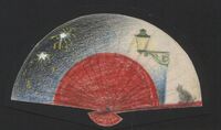 El Abanico Sobre un fondo negro destaca en la composición la imagen de un abanico abierto. El mango del abanico es de color rojo. En su parte superior como adorno se ha representado la esquina de un edificio blanco con una linterna que ilumina en una noche estrellada. Al lado del edificio hay un gato oscuro.