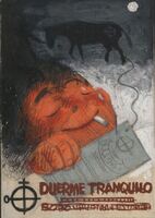 Duerme tranquilo Con el título “duerme tranquilo”, en caracteres rojos, se ha representado la cara de un chico sosteniendo entre sus labios un cigarro y mientras duerme, casi sonriendo, sujeta en su mano un papel gris. En segundo plano, sobre un fondo gris, destaca la imagen de un caballo negro y de perfil. El papel gris se encuentra unido a una pata del caballo por medio de un hilo, también gris.