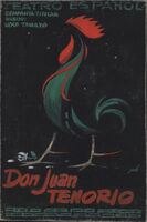 Don Juan Tenorio En este cartel cuyo título es “Don Juan Tenorio”, con las letras de color rojo, se ha representado a un gallo de perfil con el plumaje verde y su cresta roja al igual que su cuello. El fondo del cartel es completamente negro. En la parte superior se puede leer en letras verdes “teatro español. Director: José Tamayo”. A la izquierda se vislumbra el boceto en verde de la firma del pintor.