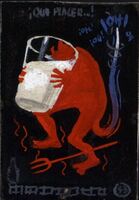 Demonio bebiendo de un gran vaso de leche En el centro de la imagen, la figura de un demonio rojo con tridente en el suelo, bebiendo de un vaso gigante. El atractivo publicitario del demonio se podría veinte o treinta años después de moda.En la parte superior se lee la leyenda "¡Que placer…! OH OH …
