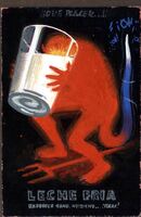 Demonio bebiendo leche .Imagen de un demonio rojo con tridente bebiendo leche deun gran vaso un fondo negro. De esta misma idea existen varias versiones, cada cual con un grado de elaboración. Leyenda: "¡¡QUE PLACER…!! -¡oh!- LECHE FRIA …"