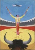 El avión vuela sobre una plaza de toros Sobre una plaza de toros en plena faena entre el toro y el torero con una banderilla en cada mano lanzándolas hacia arriba vuela un avión en un cielo muy azul. Del toro que está de espalda solamente se ve su cabeza con grandes cuernos. En segundo término aparece la figura del torero con el traje de luces amarillo. La arena sobre la que pisan es amarilla y las gradas de la plaza son grises con sus paredes rojas.