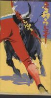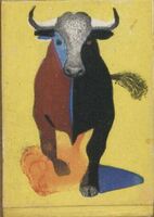 El toro y el banderillero En primer término se aprecia la pierna cubierta con un pantalón y media de color rojo, por su parte trasera, de un banderillero sosteniendo dos banderillas rojas y amarillas para clavárselas al toro negro que se dirige hacia él. Los colores que predominan en el fondo del dibujo son el amarillo y el morado.