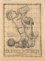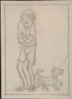 El niño toma el biberón y su cachorro Destaca en esta imagen de perfil la figura de un niño pequeño bebiendo biberón mientras un cachorro se apoya en sus piernas. Por detrás del niño hay una pelota en el suelo y en la parte inferior se destaca una frase con letras ilegibles. En este dibujo enmarcado de superficie cuadriculada destacan las líneas en tonos oscuros.