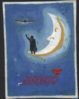 EL hombre saluda desde la luna En este dibujo enmarcado vislumbrándose un fondo negro hay una inscripción morada de difícil lectura. Se ha representado sobre un fondo azul oscuro una gran luna blanca con ojos y boca. En una de sus puntas un hombre negro y de pie saluda gesticulando con una mano. Por detrás de esta figura se encuentra un avión. Parece verse, además, a la derecha del título del dibujo el boceto en color blanco de la firma del pintor.