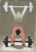 El esfuerzo del gimnasta para coger grandes pesas Sobre un fondo gris, casi marrón, destaca la imagen de un gimnasta que se agacha para intentar coger unas grandes pesas negras. Detrás de su figura se eleva una sombra blanca alzando las pesas.