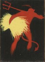 El diablo y la paja En este dibujo se representa sobre un fondo totalmente negro la figura roja de un diablo con su tridente apoyado en sus hombros y portando bajo su brazo derecho un montón de paja amarilla.