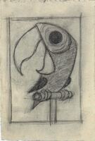 El loro de pico amarillo y plumaje verde En este dibujo enmarcado en donde se pueden ver numerosos bocetos de palabras, superior e inferiormente y al lado derecho, se encuentra sobre un fondo rojo la imagen de un gran loro sobre una barra, de pico amarillo, plumaje verde y un gran ojo negro.
