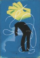 El hombre negro sobre un fondo azul Un hombre negro se ha representado en un fondo azul apoyado en un sofá igualmente azul. La figura humana está de espalda. A su alrededor flota en el aire un hilo blanco con forma ondulante que atraviesa al hombre en algunas partes de su cuerpo. Y en la parte superior destaca una mano de color amarillo que coge dicho hilo sujeto a un alfiler como si costurase.