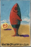 El pez Sobre una superficie amarilla queriendo parecer la arena de la playa se ha dibujado un pez rojo sosteniéndose sobre su cola, en posición vertical, por tanto. En segundo plano destaca el color azul del cielo y una pelota amarilla y roja sobre la arena.