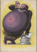 El nativo de gran barriga La figura de lo que parece ser un nativo de una tribu africana con una descomunal barriga y una falda de flecos marrón apoya su mano izquierda sobre un objeto blanco mientras que su mano derecha la lleva a la cara que inclina hacia atrás y en la que destaca una gran boca de labios gruesos de color rosa. El color de su piel es morada y a su alrededor, sobre un fondo claro, le envuelve una áurea amarilla.