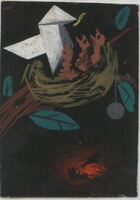 El nido Sobre un fondo muy oscuro destaca, en este dibujo, un nido sobre una rama con hojas verdes. En su interior se ven tres pájaros marrones y un pájaro de papel blanco que porta en su pico una lombriz amarilla para alimentarlos.