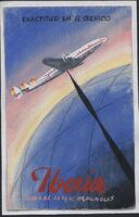 Exactitud en el servicio: Iberia. Líneas aéreas españolas. En el dibujo enmarcado y bajo el lema de “exactitud en el servicio” se ha representado un avión blanco de la compañía Iberia volando en un cielo azul y rosáceo en donde se ve a la izquierda el globo terráqueo igualmente azul dividida su superficie en cuadrados.Boceto realizado para la compañía Iberia