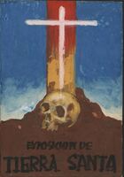Exposición de Tierra Santa En este cartel con el título en letras de color negro de “exposición de Tierra Santa” se ha representado la imagen de un calvario en el que destaca una cruz sobre un montículo de tierra marrón y a sus pies una calavera. Detrás de la cruz blanca destaca, en un cielo azul, una franja vertical de color amarillo y rojo.