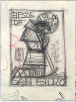 Exposición Nacional de Bellas Artes Sobre un fondo claro, las siluetas esquemáticas de figuras situadas en distintos planos creando sensación de profundidad. Aunque muy superficialmente, el boceto está cuadriculado para traspasarlo a un tamaño mayor Leyenda "EXPOSICION NACIONAL DE BELLAS ARTES".