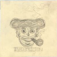 Exposición Bajo un fondo amarillento y con la inscripción de “exposición” se ha dibujado a lápiz el boceto del retrato de un torero fumando una pipa de la que sale una pequeña humareda.