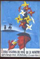 Feria Regional del Vino de la Mancha Sobre fondo azul, se observa en lo lejos una colina con las siluetas de Don Quijote Y Sancho, y en primer término la cara de perfil de un hombre con gorra bebiendo una vaso de vino. Leyenda: FERIA REGIONAL DEL VINO DE LA MANCHA SEPTIEMNRE 1952. VALDEPEÑAS (Ciudad Real)