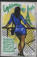 Españolas en París Con el título de “españolas en París” en la parte superior de esta composición y en color verde se ve la imagen de una mujer de pelo negro y largo, con un traje de falda corta y azul apoyada a una verja mientras observa el paisaje lejano en el que destaca el monumento de la Torre Eiffel. En el lado derecho de su figura se ven algunas palabras en verde de difícil lectura por tratarse de bocetos. El fondo del dibujo es gris y en el centro destaca el color amarillo resaltando el paisaje observado por la mujer.
