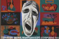Exposición de Arte Hispanoamericano En el centro de este dibujo, todo ello dividido en pequeños cuadrados en los que se desarrollan distintas escenas, destaca en el centro una máscara blanca de boca abierta con los rasgos dolorosos muy marcados. Predominan en la composición los colores azules, verdes, rojizos y naranjas. Inferiormente, se puede leer, en letras blancas, “exposición de arte hispanoamericano”.