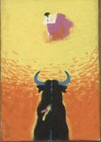 Enfrentamiento entre toro y torero Sobre un fondo mitad amarillo y mitad naranja queriendo parecer la arena de una plaza de toros se han representado dos figuras: de espalda un toro negro con banderillas y, en un segundo plano de frente, un torero haciendo movimientos al toro con su capa rosa. El toro se encuentra en la mitad naranja mientras que el torero en la mitad amarilla.