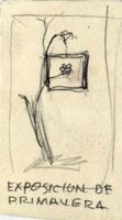 Exposición de primavera En este dibujo enmarcado con líneas abocetadas y en la parte inferior se destaca bajo el lema de “exposición primaveral” la imagen de un árbol sin hojas. De una de sus ramas cuelga una flor metida en un cuadrado.