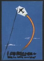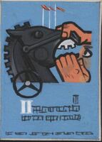 El volante, la cabeza de caballo y el hombre Sobre un fondo azul se representan en el dibujo tres elementos: una cabeza de caballo negra, un hombre que con sus manos intenta abrir su boca y un volante negro. Debajo se puede ver el boceto de algunas palabras en color negro de difícil lectura. En la parte superior se ven tres banderas de España sujetas a tres palos blancos.