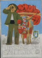 Fiestas de San Isidro En este cartel que anuncia las fiestas de San Isidro, como se puede ver en el título realizado a lápiz y de forma abocetada en la parte inferior, se representa a un hombre que parece un vendedor ambulante llevando un burro marrón cargado con una cesta llena de algún producto de color rojo. El hombre con el traje verde, camisa blanca, fajín negro y sombrero grita intentando vender sus productos. En el fondo del dibujo destaca el color azul y al lado izquierdo del burro está presente el escudo de Madrid.