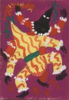 Fiesta de disfraces Dos figuras encapuchadas y disfrazadas se divierten bailando en un escenario cuyo fondo es de color morado. En primer término se ve a un personaje de espalda con un traje amarillo a rayas onduladas rojas y fajín verde. El segundo personaje, en segundo término, aparece mirando hacia el frente con un traje rojo con adornos en blanco y una gran capucha negra tapándole la cara.