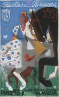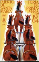 Fiesta en el Puerto de Santamaría. 1953 En este cartel que anuncia las fiestas del Puerto de Santamaría en el año 1953 se han representado en el centro de la composición varias figuras: en primer término, a la izquierda, destaca un caballo marrón; en el centro, una pareja con el traje andaluz sobre un caballo blanco; detrás, se vislumbra un caballo marrón. Tres mariposas amarilla, blanca y roja revolotean entre las figuras. En el fondo del dibujo destaca el color azul del cielo y la verde hierba sobre la que se sitúan los personajes de la escena.