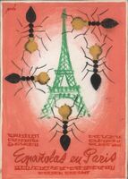 Españolas en París Destacando sobre un fondo rojo con las letras del título también en color rojo en la parte inferior se aprecia el monumento de la Torre Eiffel de color verde rodeada por una luz blanquecina. A su alrededor destacan cinco hormigas negras y amarillas. En la parte superior se puede ver el boceto de la firma del artista.
