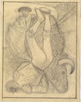 Un toro coge al torero En el dibujo enmarcado donde predominan las líneas grisáceas un toro coge a un torero que vuela por los aires, así como se puede apreciar en primer término. Detrás de la figura del animal destaca un torero con su capa dispuesto a desviar la atención del toro.
