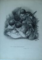 Una nueva magia negra 2 Dibujo que representa a tres soldados en las trincheras, dos de ellos observando un plano atentamente y detrás un soldado agazapado vigilando, debajo el rótulo donde se puede leer “Una nueva magia negra” dibujo 1º.