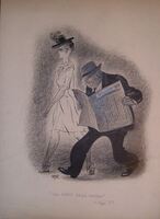 Una nueva magia negra Dibujo que representa la imagen de una mujer esbelta con traje blanco y sombrero negro andando junto a un hombre maduro ligeramente inclinado que va leyendo el periódico, debajo de ellos aparece el rótulo donde se lee “Una nueva magia negra”, dibujo 3º.