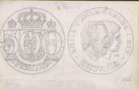 500 Pesetas Boceto a lápiz de la moneda de quinientas pesetas, en una de sus caras el escudo Constitucional en cuyo centro se dibuja los números y a su lado los perfiles de los retratos del Rey Juan Carlos y la Reina Sofía.Boceto realizado para la Fàbrica Noacional de Moneda y Timbre para la moneda de 500 pesetas¡. Sin mas referencias.