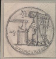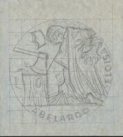 Abelardo y Floisa Boceto a lápiz de una de las caras correspondientes a una medalla donde se aprecia la figura de un hombre con una corana que cae de su cabeza, de rodillas ante un podio donde el filo de la hoja de un hacha guillotina sus partes más íntimas.