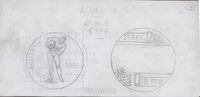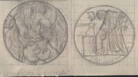 Acuarios y carnavales Boceto a lápiz de dos caras de unas medallas con diferentes temas pero mismo significado en la relación de fechas, la primera con la imagen de una mujer desnuda con un cántaro de donde sale el agua que le cae en el pie, junto a las dos fechas correspondientes a carnavales.