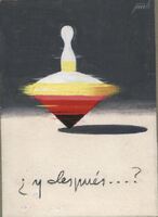 ¿Y después…? Sobre un fondo mitad blanco, en donde se lee “¿y después…?”, y mitad negro destaca la imagen de una peonza blanca, amarilla, roja y negra que gira incesantemente. En la esquina superior de la derecha se vislumbra, en tonos grises, el boceto de la firma del pintor.