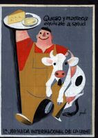 1ª Jornada internacional de la leche Imagen de un hombre corpulento, vestido con su mono de trabajo y boina, llevando en una mano una bandeja cubierta de quesos, y con el otro brazo cargando a una vaca. El dibujo está cuadriculado. Firma parte inferior. Leyenda en la parte superior "Queso y manteca equivale a salud" y en la parte inferior "1ª JORNADA INTERNACIONALDE LA LECHE"